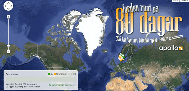 Jag brukar vara med i utmaningarna på jogg. Mest för att jag brukar klara dem med god marginal utan att anstränga mig, och därmed liksom få en gratis chans att vinna en resa. I år heter utmaningen “Jorden runt på 80 dagar” och på dessa 80 dagar ska man alltså springa 30 mil, cykla 100 mil eller simma 3 mil. Eller en kombination…