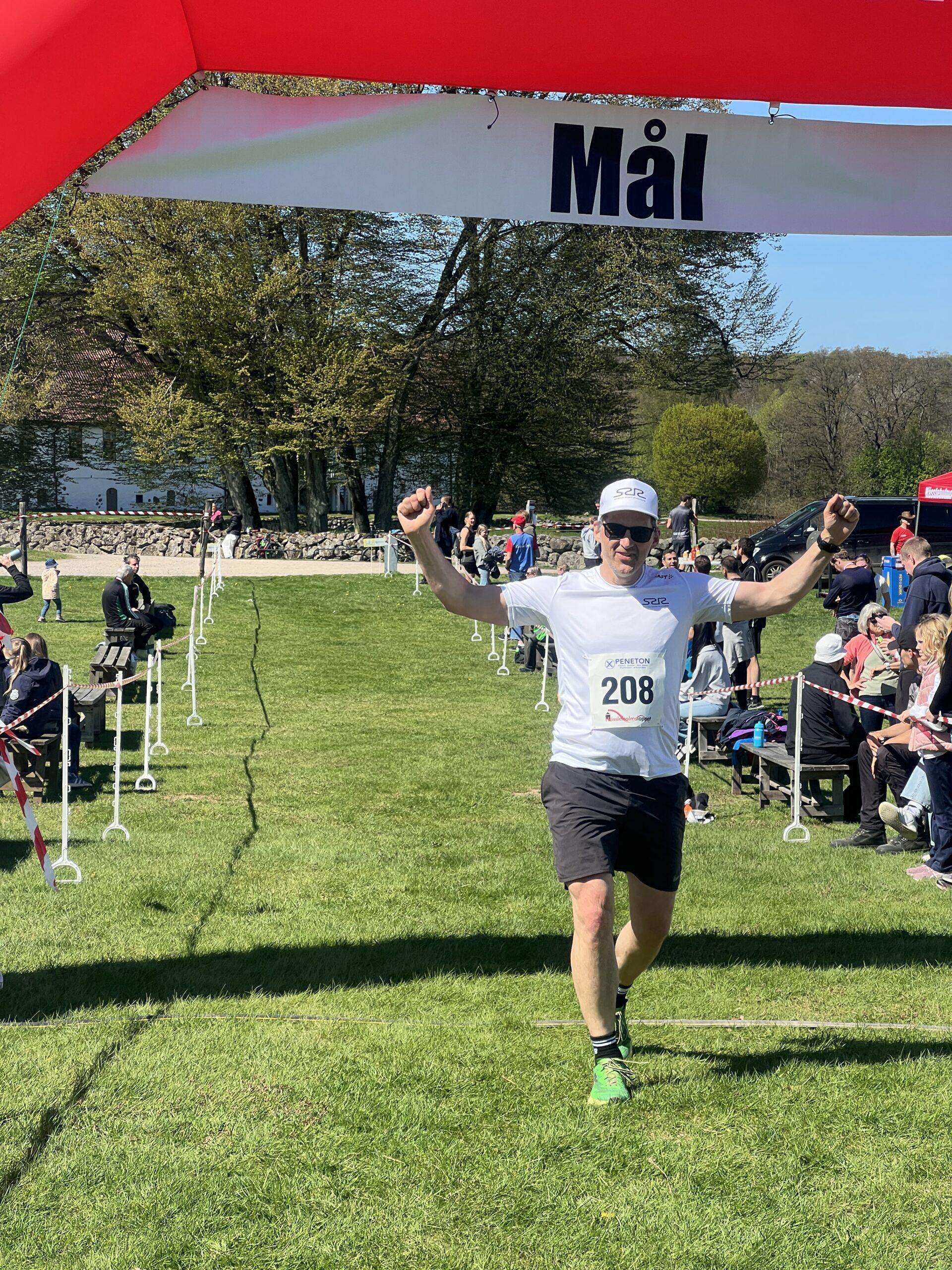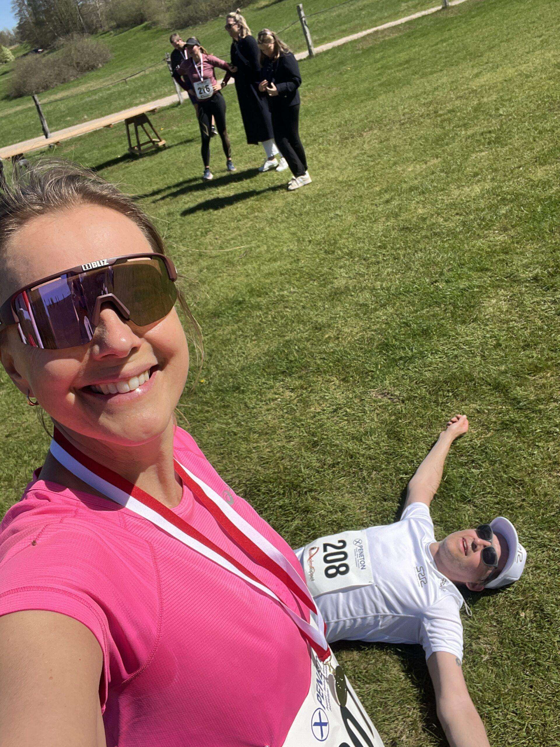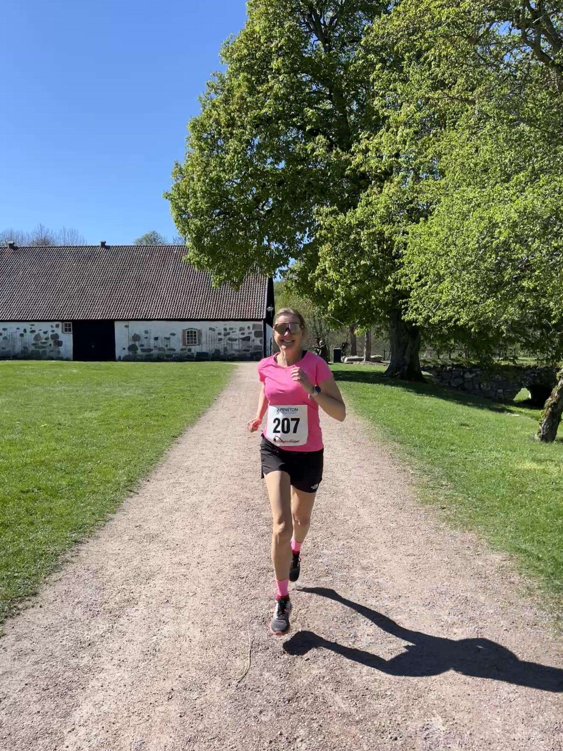 Sista kilometern är nerför. Då vet man att man överlevt den här gången med. Att resten är en fest. Jag blir omsprungen av mannen som legat mig i hasorna sista biten men orkar inte svara. Foten protesterar lite i de tokbranta nerförsbackarna och vill inte utmana den. Rullar ner, över slottsgården, in i målfållan och över de sista grästuvorna när jag hör mitt namn i högtalaren. Går i mål och får en medalj runt halsen, i kategorin ”kul att ta en bild med, men sen hamnar den mest troligt i soporna”. Loppets enda minus. I övrigt är det bara så fint!