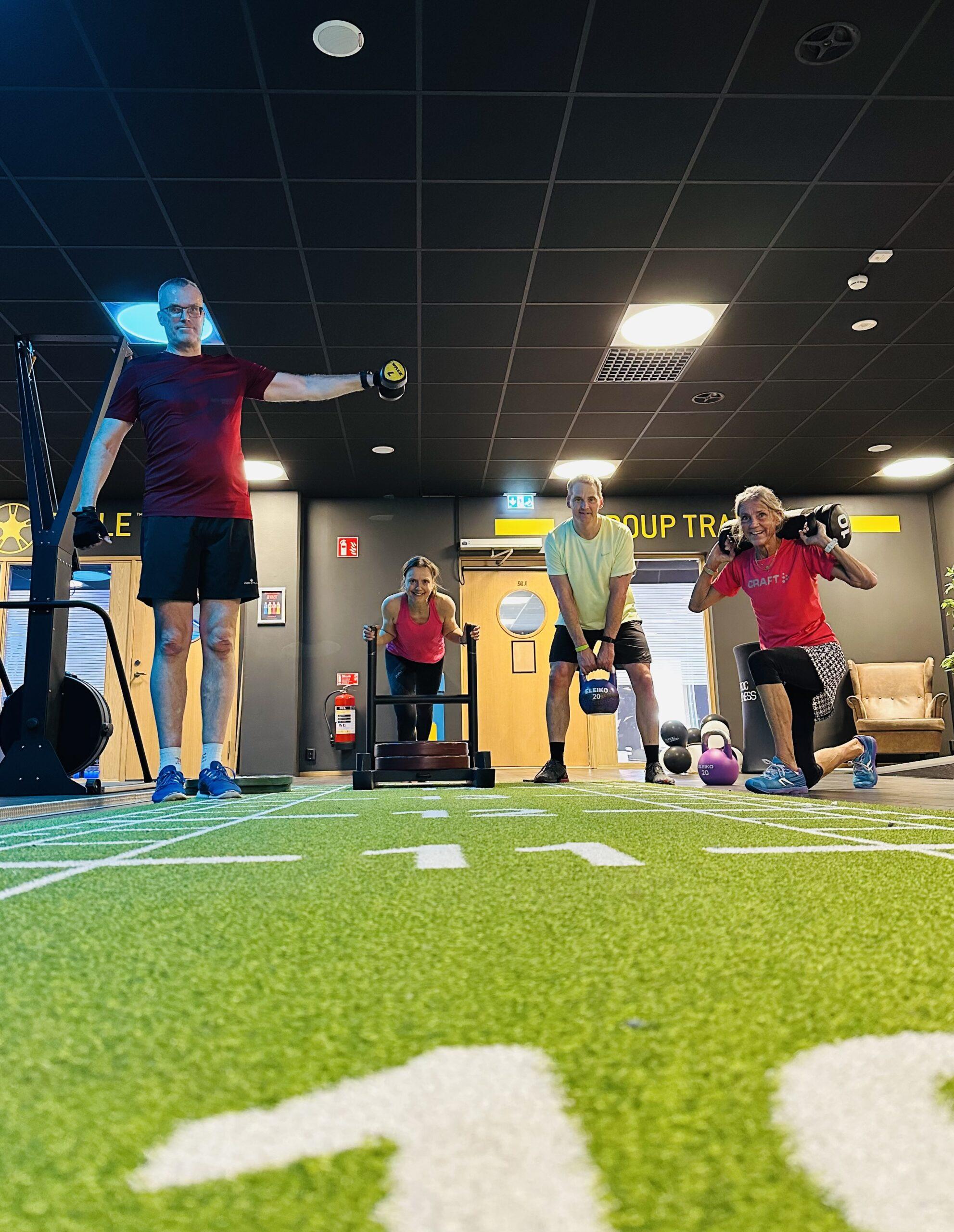 Favoriten blir att putta en släde med tunga vikter på. Pulsen skjuter i taket men jag känner mig stark på ett coolt sätt. Att hoppa fram med hjälp av burpees är också kul. Speciellt som jag gasar om Fredrik ganska lätt. Lyssnar inte ens när han skyller på sin betablockerare…