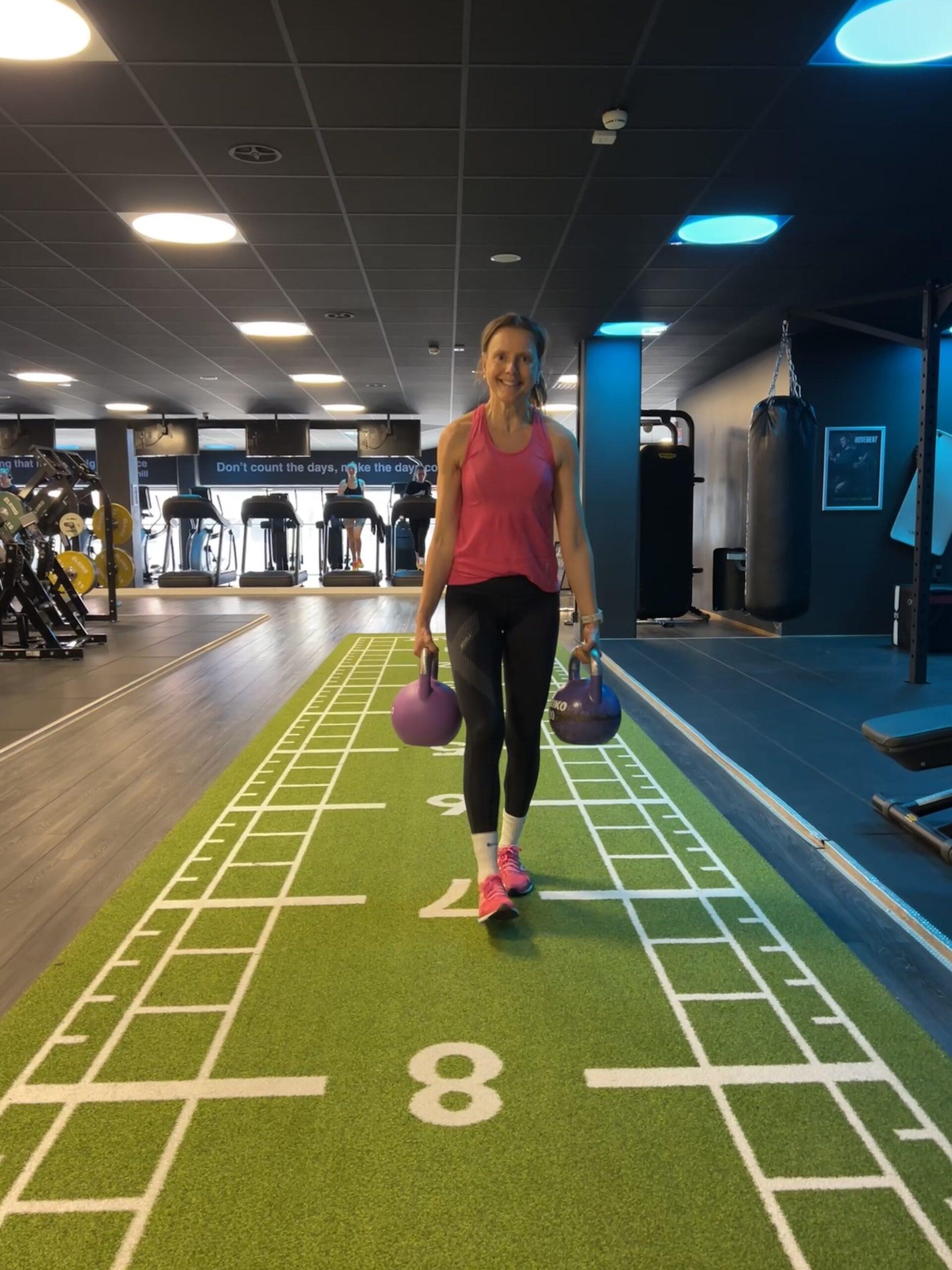 Utfallsteg med 10 kilo på ryggen känns ok, men jag är lite för oexplosiv och slow för mitt eget bästa. När det gäller farmers walken lastar jag upp 20 kilo i varje hand och nästan springer fram över golvet. Det är inte för att jag vill springa, utan för att jag vill hinna fram innan jag tappar vikterna i golvet. Handsvetten har nått nya höjder och det skulle vara pinsamt att tappa kettelbellsen på tån och avsluta helgen på akuten.